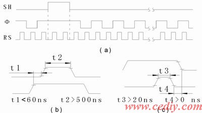 TCD1500C的驱动时序如图3-(a)所示,其工作频率≤8MHz,取 fF=1MHz,fRS=2MHz,TSH≥(5340+64+12)/2ms。其中图3-(b)时序由 图1-(b)实现,由单片机强制置位,以满足电荷向移位寄存器转移;图3-(c)时序由 图1-(d)实现,其中Re选用精密可调电阻,Ce>1000pF,延迟时间由公式Tw=0.45 * R *C 决定,也可以在示波器上观察调制。